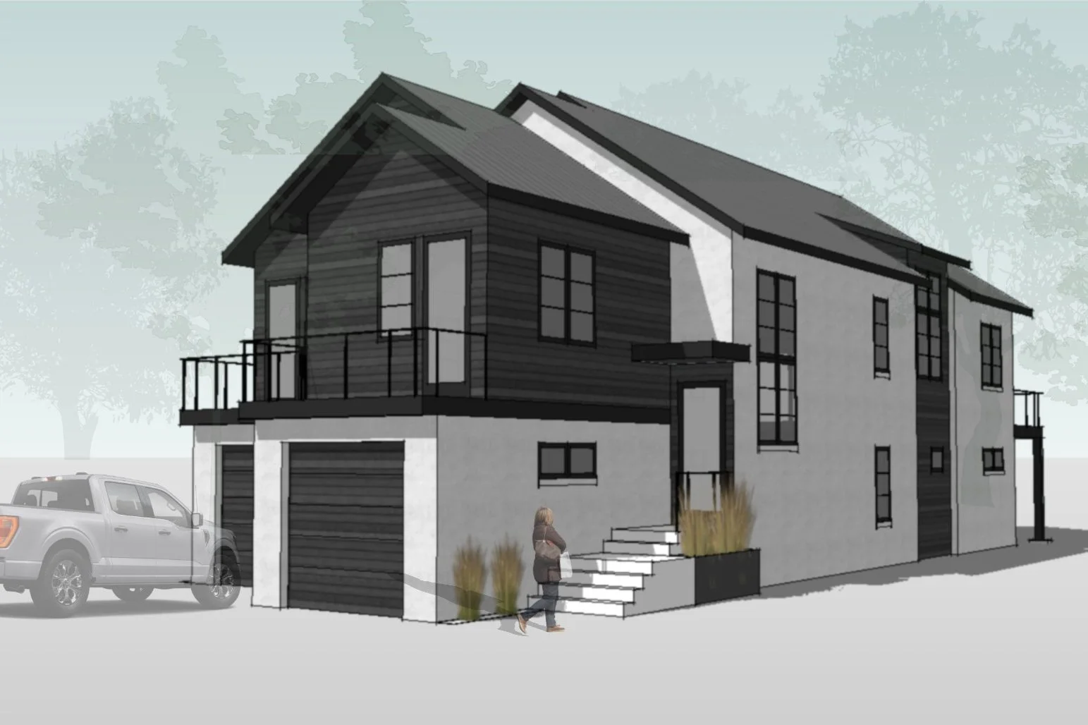 This project consists of two identical duplexes, each with an above-garage ADU. Since these are located in an established residential neighborhood, we wanted the units to look more like individual houses. By offsetting the units, we were able to better maintain a traditional single family street facade. These eight living units are within walking distance to all city amenities and are a great example of bringing human-scale residential density to an urban neighborhood.