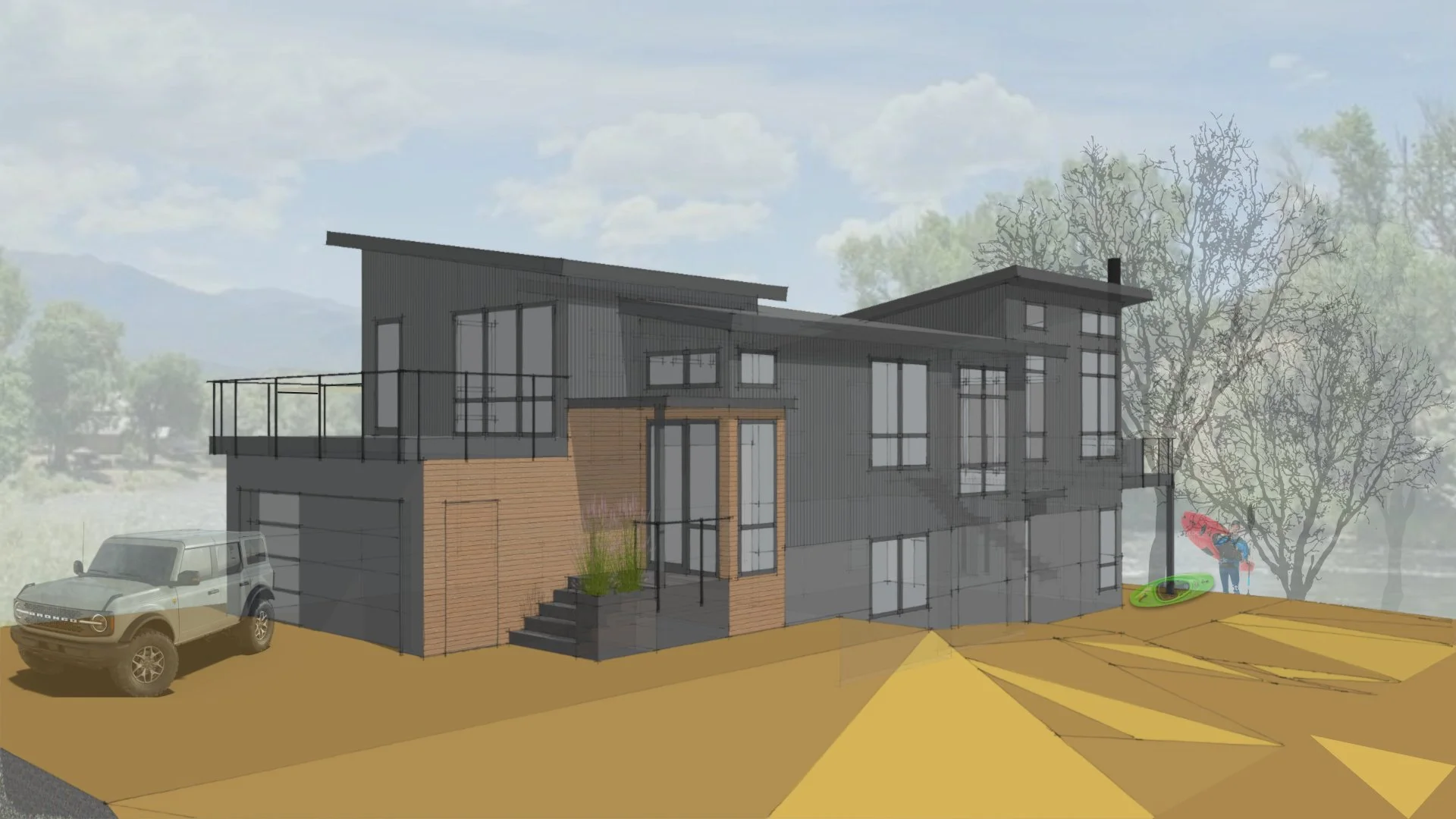 Set on a narrow lot on the bank of the Arkansas River, this dynamic building will be the future home of two former raft guides who once helped visitors navigate these same waters. Not surprisingly, river access and views was the primary driver behind the design. Toward that end, the main living area is on the upper level, which provides the best views of the river and the hills beyond. Interior level changes (from the entry to the upper floor, and up again to the office) help give the house an engaging flow, while the main southeast-facing stairwell adds light to both levels.