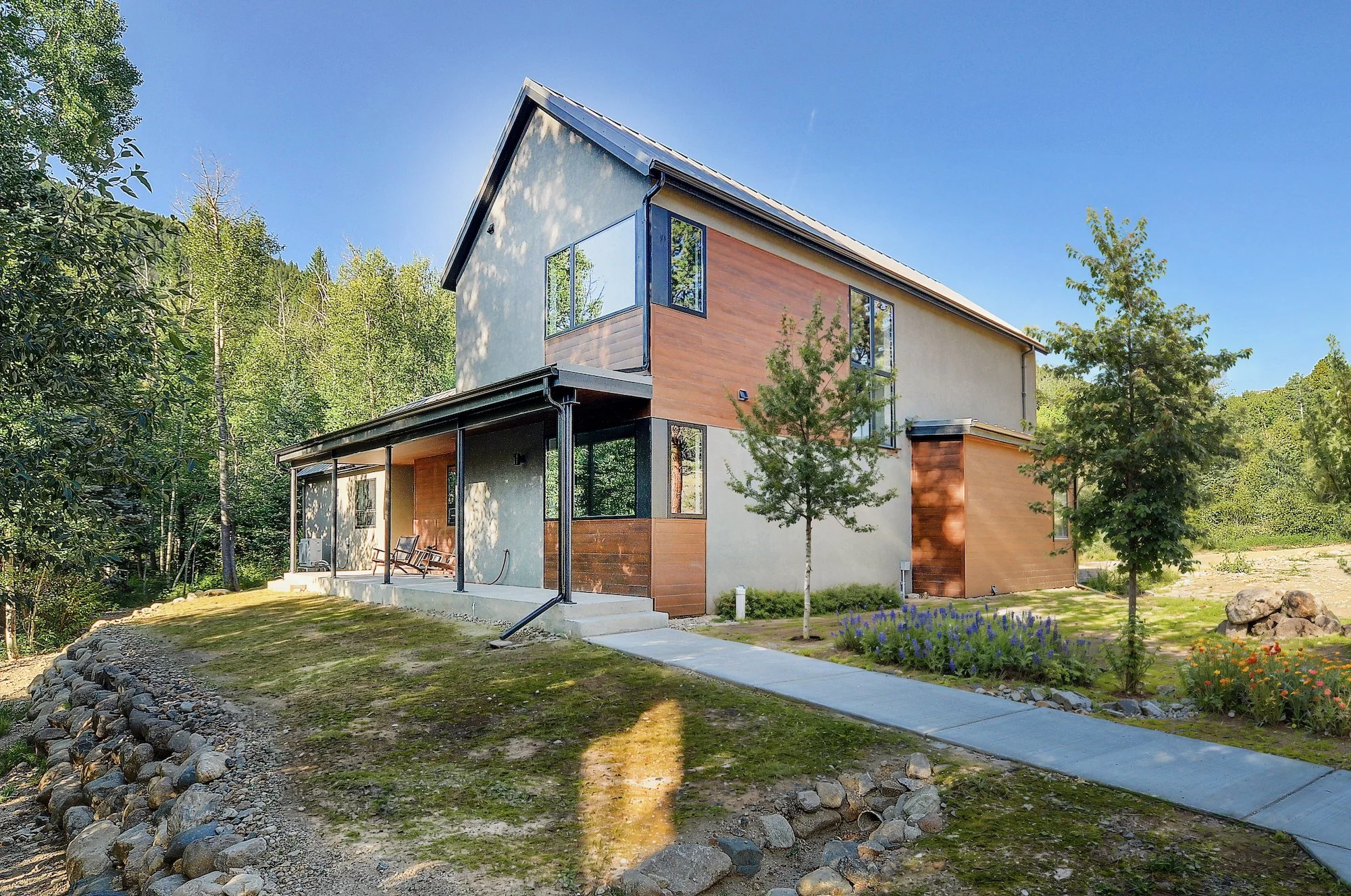 Our clients were lucky to find a sliver of land along the South Arkansas River, literally just minutes from Monarch Mountain ski area. Our task was to help make use of an existing building pad and create a house that embraces the sounds of the river and surrounding views while shielding noise from a nearby state road. The “L” shaped design orients the main living spaces toward the river and creates a courtyard that defines an outdoor living area. The house is oriented to maximize solar gain to a rooftop array. Given the wildfire risk in the area, exterior finishes are all non-combustible, including weathered steel and wood-look steel plank siding.