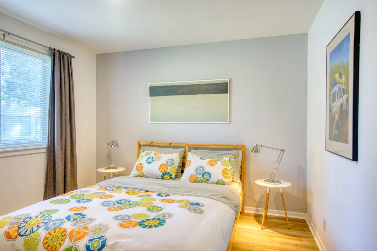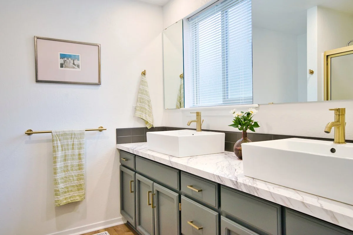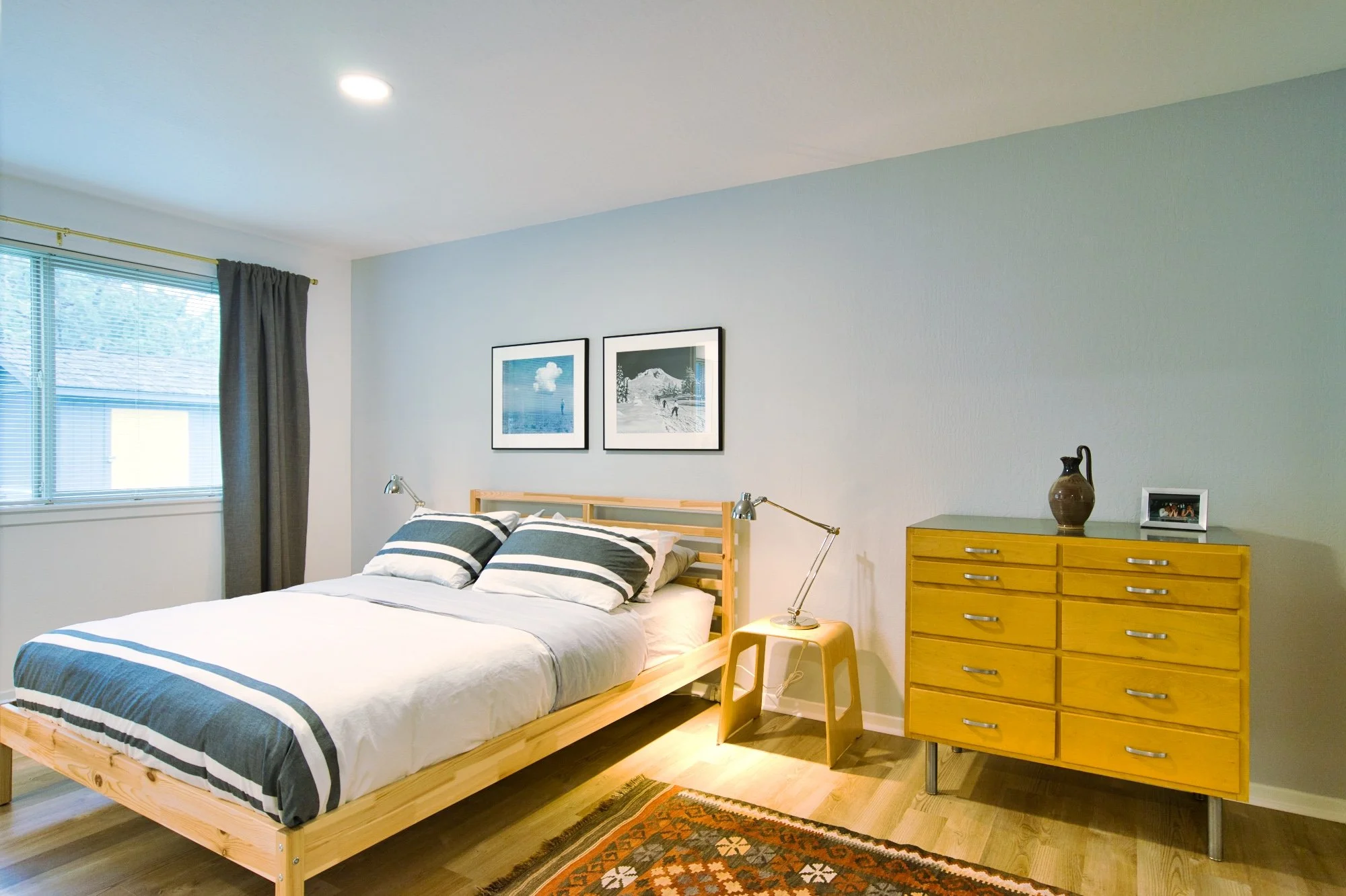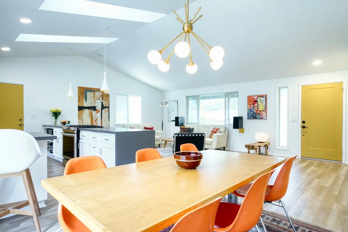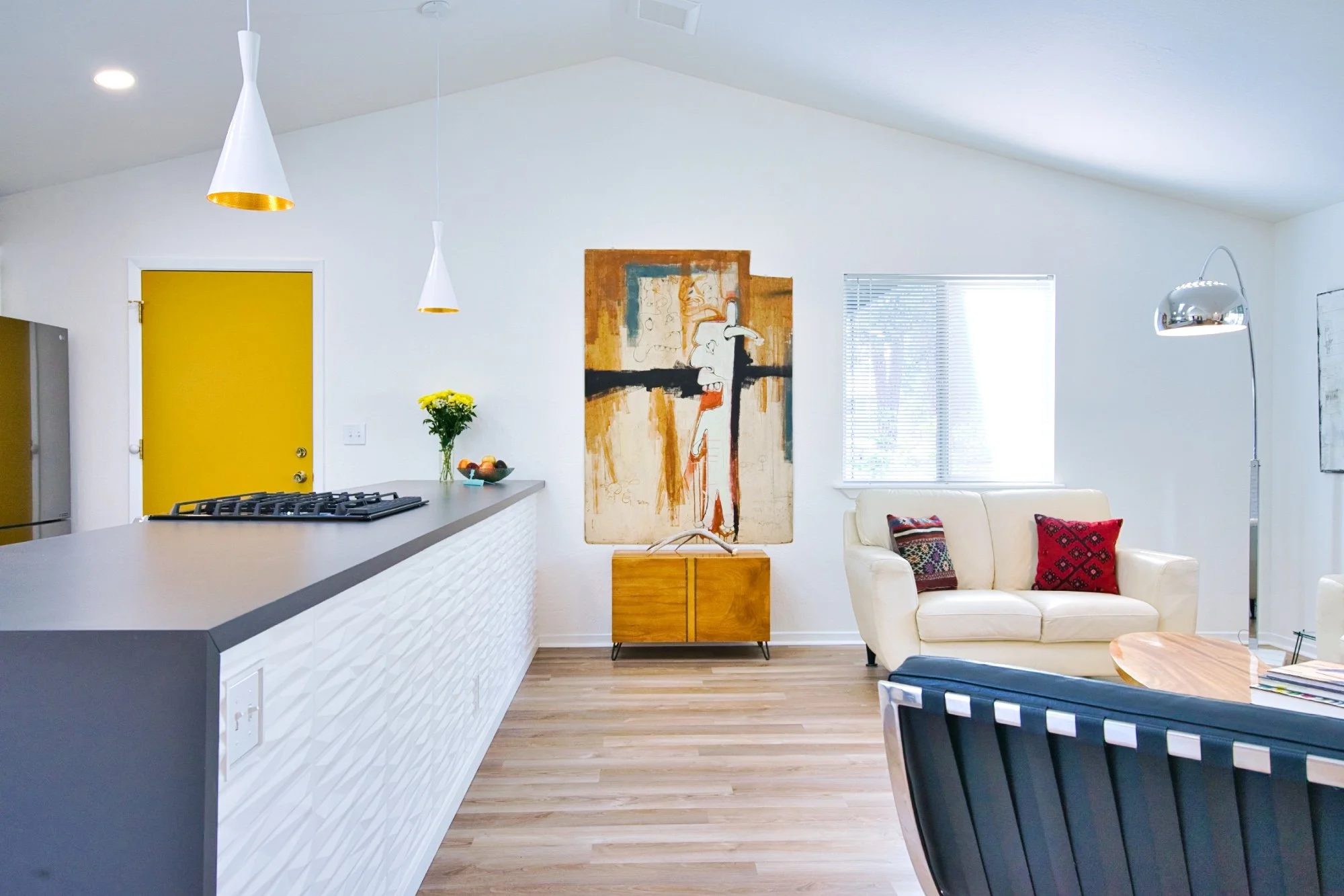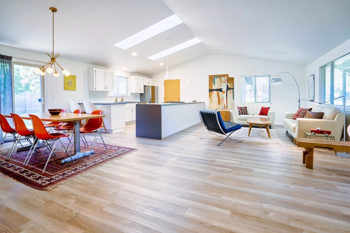 Virtually untouched since it was built, our second 1979 ranch makeover is a great example of how old houses can be recycled and made new again. A partial-height wall divided the kitchen and living room, hiding the full potential of the space’s vaulted ceiling and original skylights. We tore down the wall and associated cabinets, and ripped out the ton (literally) of bricks surrounding the wood stove. We reclaimed all the original wood cabinets by applying multiple coats of paint and fresh hardware. New plumbing and lighting fixtures throughout, a new roof, and a new HVAC system make this house functionally as good as new.
